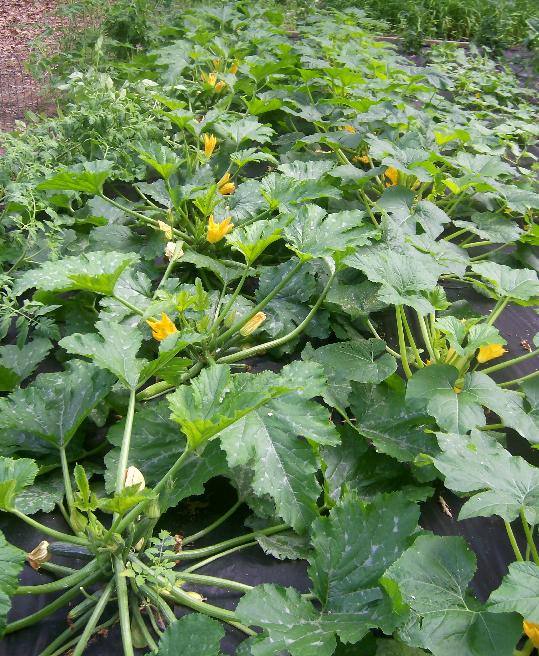 Putting plastic on the ground where the zukes or squash will be helps a lot in keeping the plants from getting soil born virus and mildews, usually from dirt splash up during rain. Eventually the powdery mildew gets mine too, but I try to forestall it long as possible. I spray Sevin once per week to keep those beetles that look like yellow ladybugs away because they not only eat the plants they can infect them too. Either there are not that many this year, or my weekly attentions have been successful. I like Sevin because it isn't persistent too long, breaks down so no buildup of pesticide residues, supposedly. I spray only in evening when the honey and bumble bees tend not to be there as much as they are in the mornings.