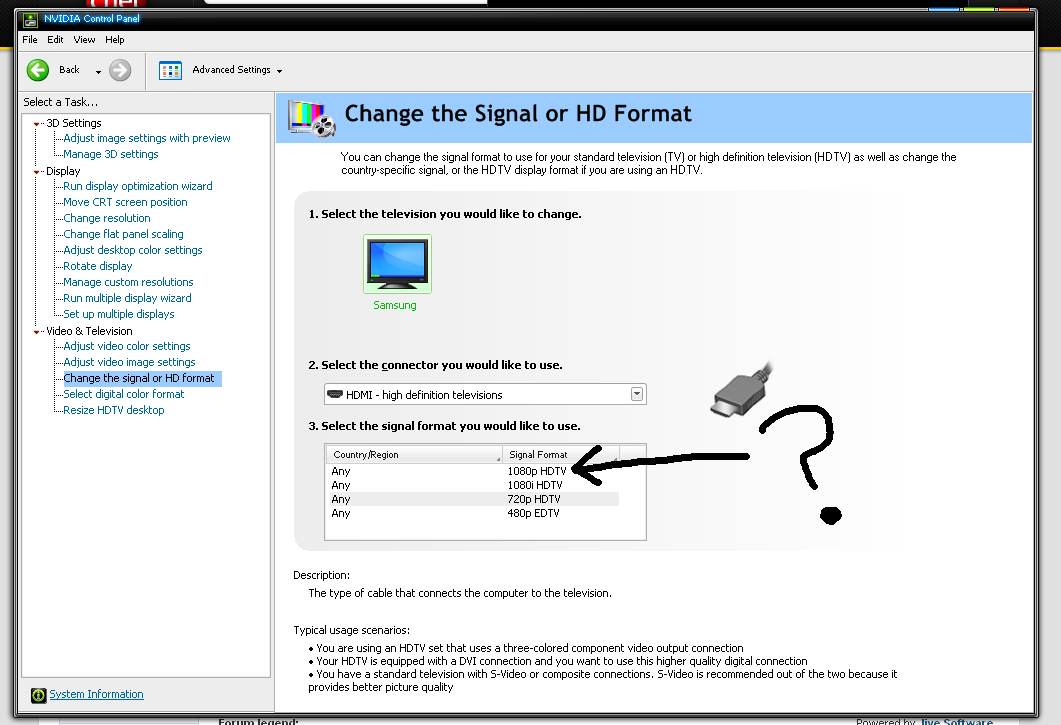 I just got the LN32A300 today and hooked it up to my video card. It's saying I can change the signal format to 1080p. When set to 1080i the info on the tv displays the resolution as "1920x1080i"..but when set to 1080p the info displays the resolution as "1920x1080"..without the "i". So I don't really know what's up with this.